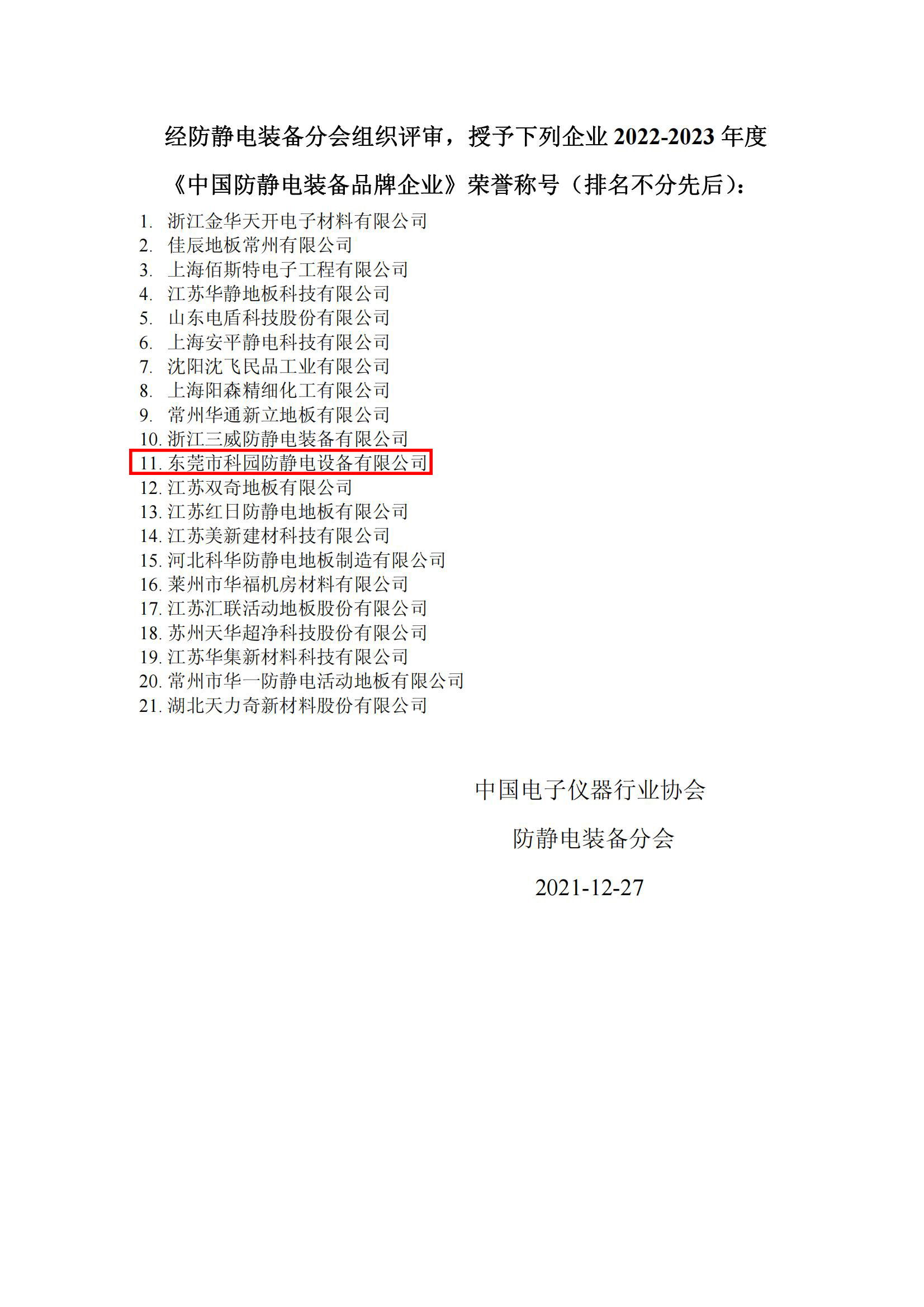 12月27日,東莞市科園防靜電設(shè)備有限公司(卡帕爾國際)生產(chǎn)的除靜電設(shè)備,得到中國電子儀器行業(yè)協(xié)會 防靜電裝備分會高度肯定,經(jīng)防靜電裝備分會組織評審,授予2022-2023 年度 《中國防靜電裝備品牌企業(yè)》榮譽稱號,華南地區(qū)唯一獲獎企業(yè)!