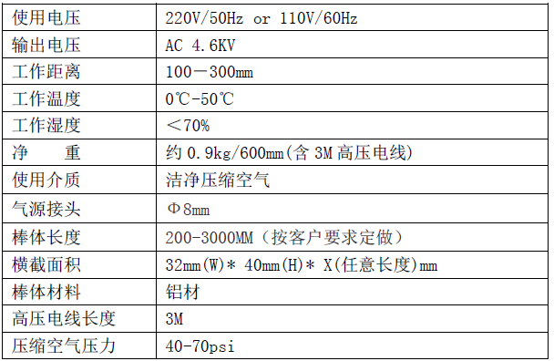 KP502A 第4.5代機械與智能型離子風棒是一種常用于消除靜電吸附的灰塵的除靜電裝置。需要配壓縮空氣和 4.6KV 的KP401A 第4.5代機械與智能型高壓電源供應器才可使用。長度可以按客戶的要求定做。